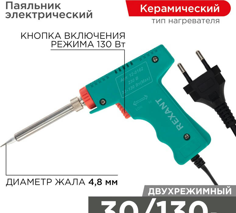 12-0162, Паяльник-пистолет двухрежимный с керам. нагревателем, серия МАСТЕР, 30/130Вт, 230В